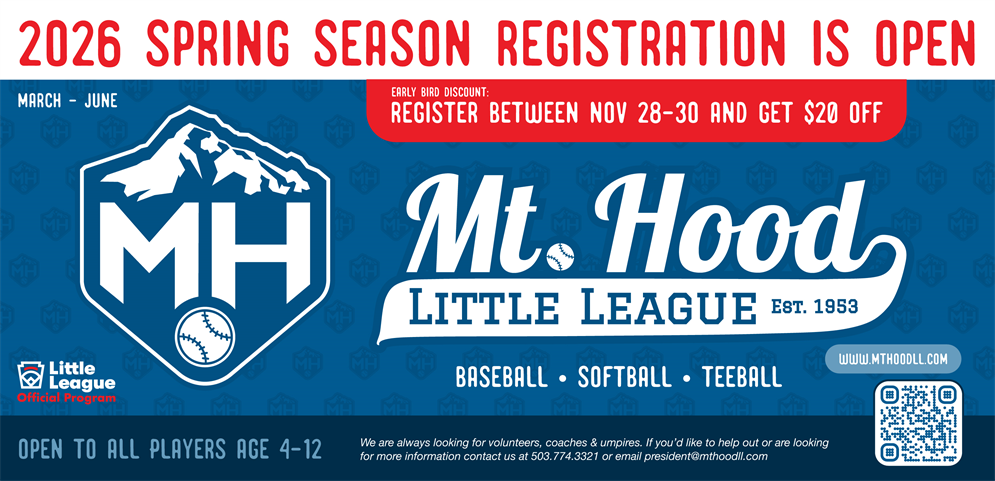 Register now for the 2025 Spring seasons of baseball and softball with Mt. Hood Little League. Register before Jan 1st and get $20 off the registration.